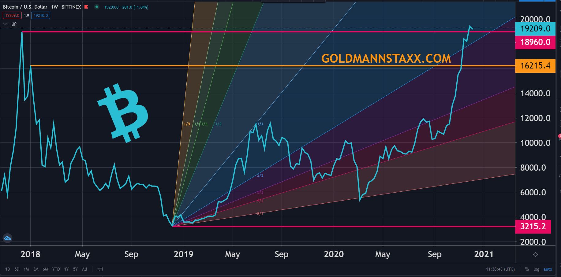 Bitcoin is now in uncharted territory on the weekly chart as price sets new all time highs across the board Sunday 12-6-20. Currently trading at ~ $19,200 USD.