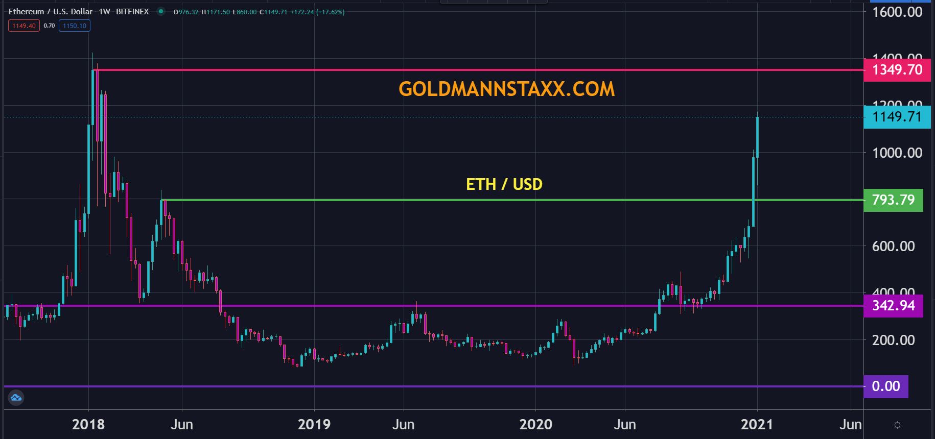Ethereum prices skyrocketed to over $1000 USD this week as the #2 crypto currency by weight follows bitcoin’s lead.
