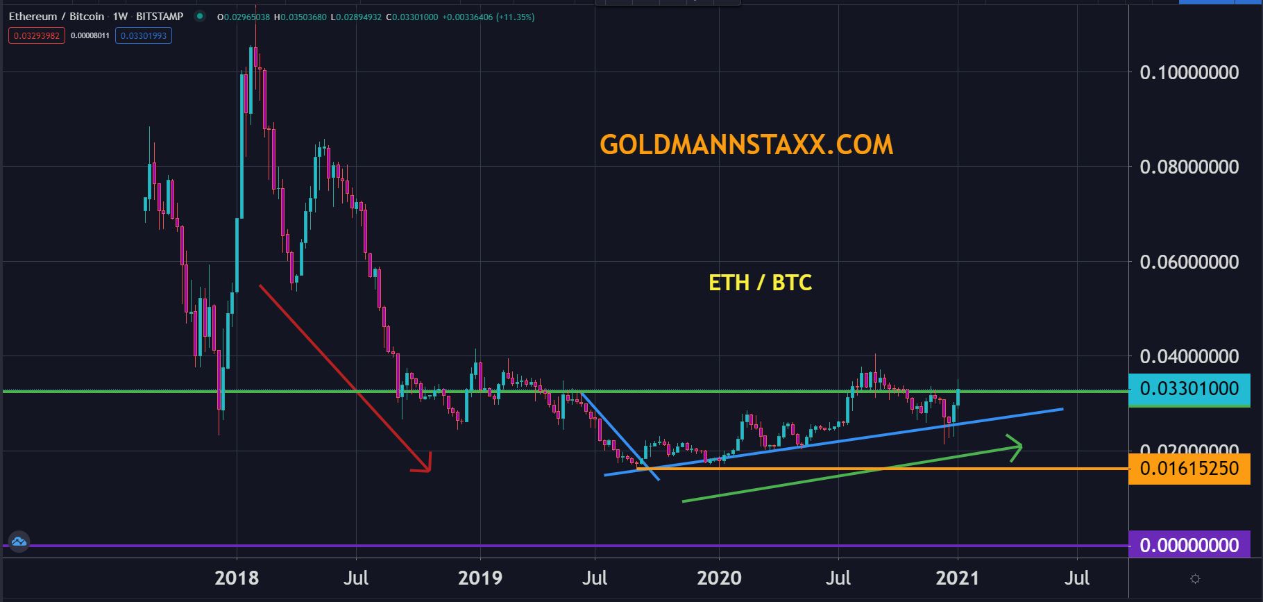 ETH / BTC continues to consolidate under resistance, indicating possible breakout. Confirmation of a 3 year trend reversal could lift ETH / USD prices to all time highs ($1500 USD) and beyond.