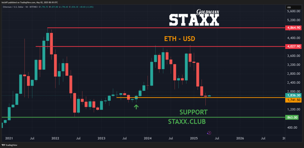 2025 has not been kind to Ethereum’s price as a brutal February lead to some stabilization in March. April held support at $1750. The market is testing support at the $1800 price level and weekly momentum indicates a high probability for a bounce in May. How much remains to be seen!